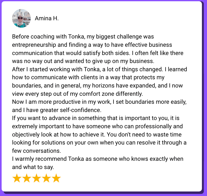 I do this through individual coaching, workshops, and online programs. Just like I helped Amina: