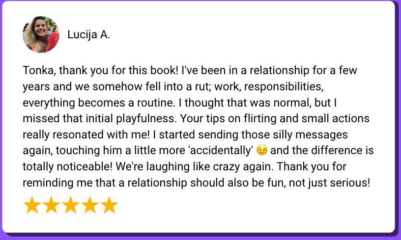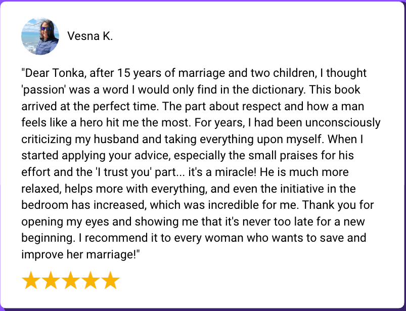 Honestly, I was a little skeptical. I've read a ton of books on relationships and nothing ever worked. But Tonka's approach is... different. It's practical, with no philosophy. Those action steps are the best! After just a couple of weeks, I noticed my husband was trying harder, he even suggested we go on a date himself! 🥳 I recommend this to every woman who feels like she's stuck.